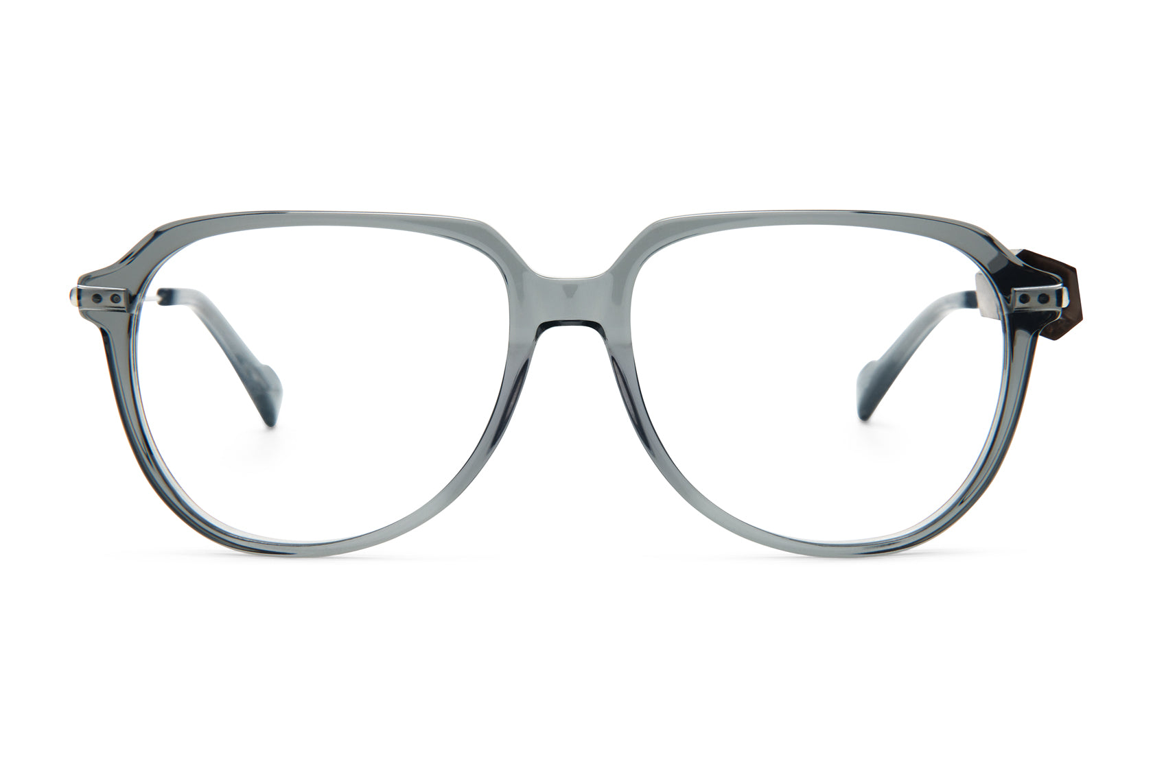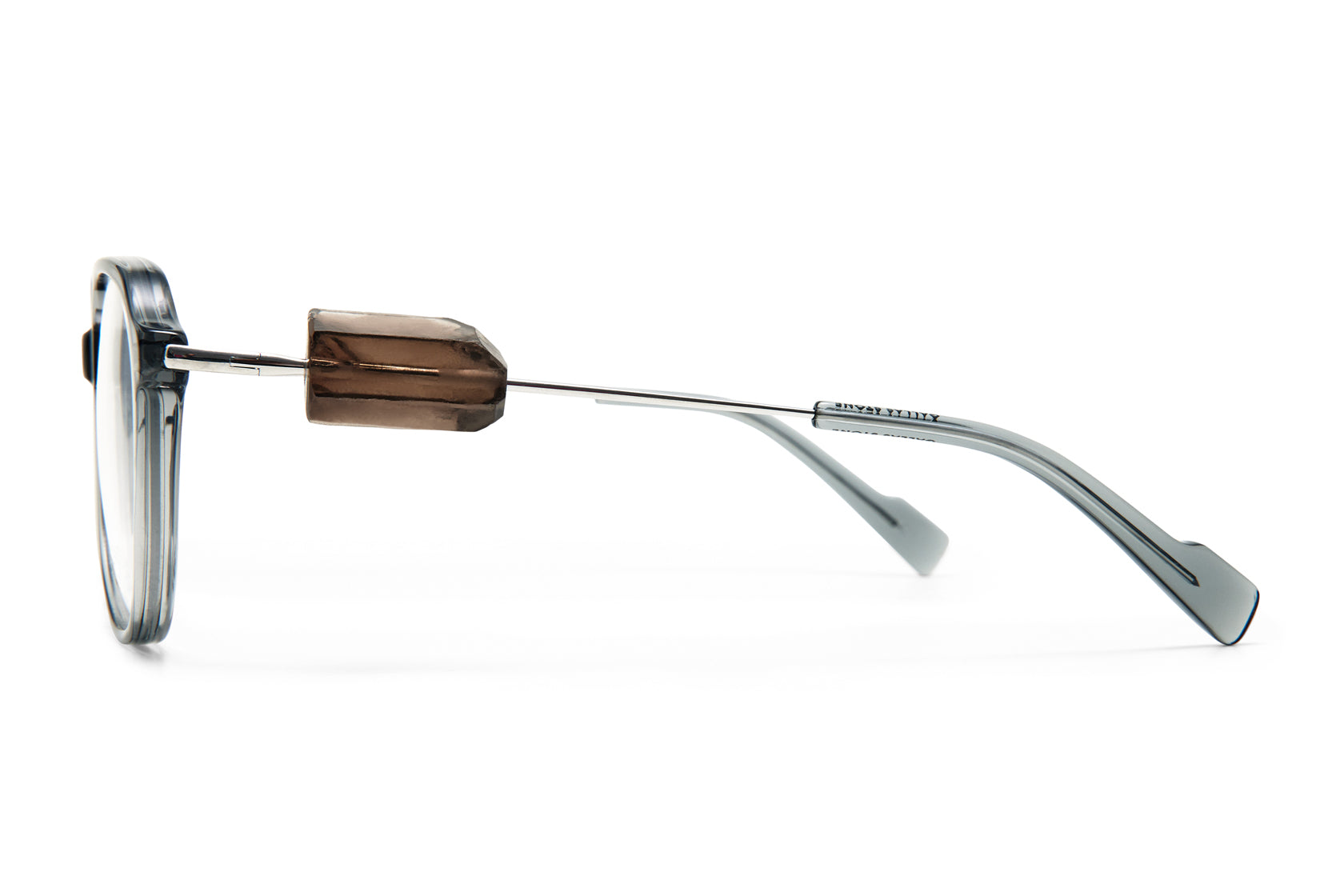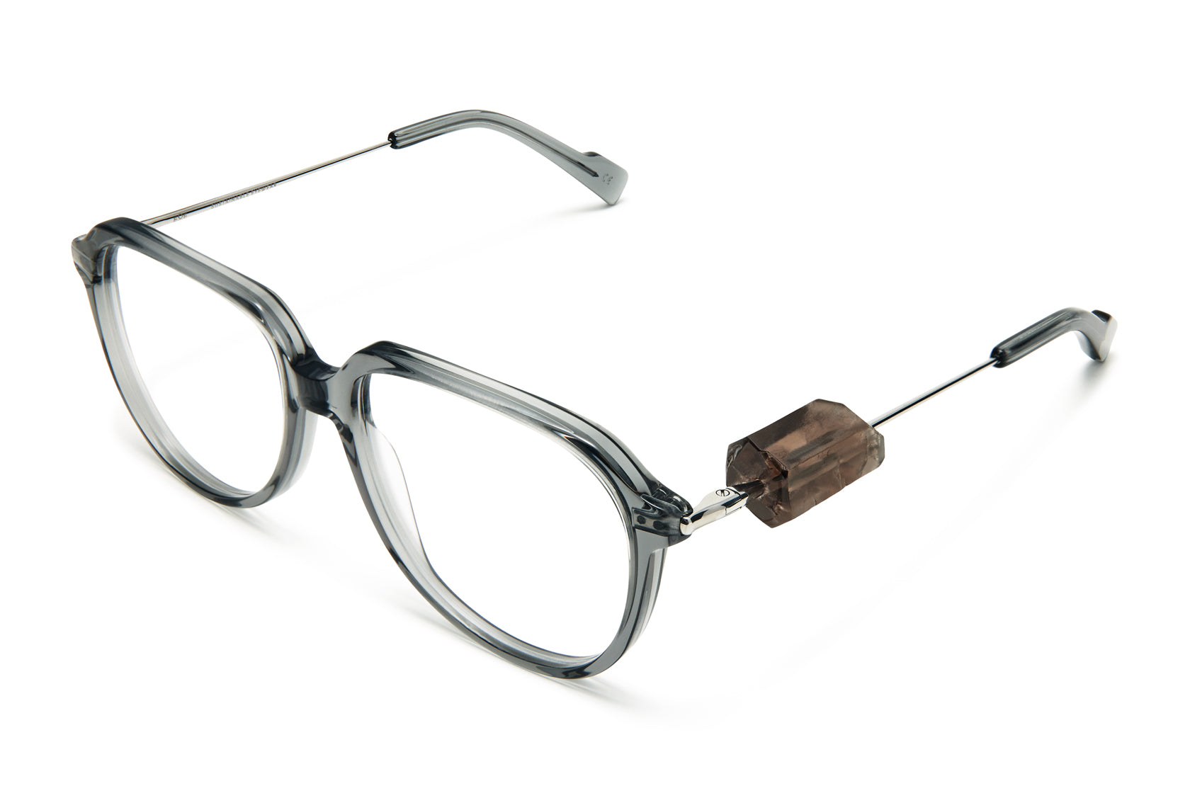 GALLAS STONE is a light aviator frame crafted from biodegradable acetate and titanium. The temple is decorated with a hand picked smoke quartz. Please note that the stones are natural, and therefore unique.