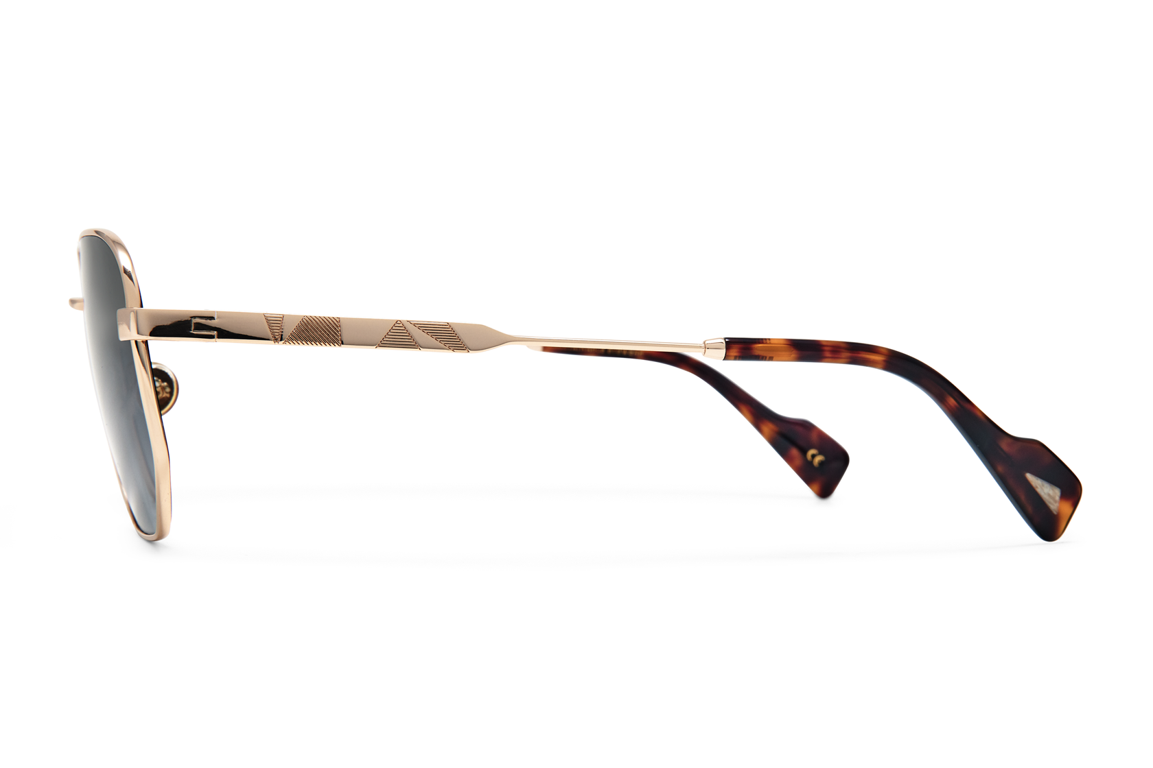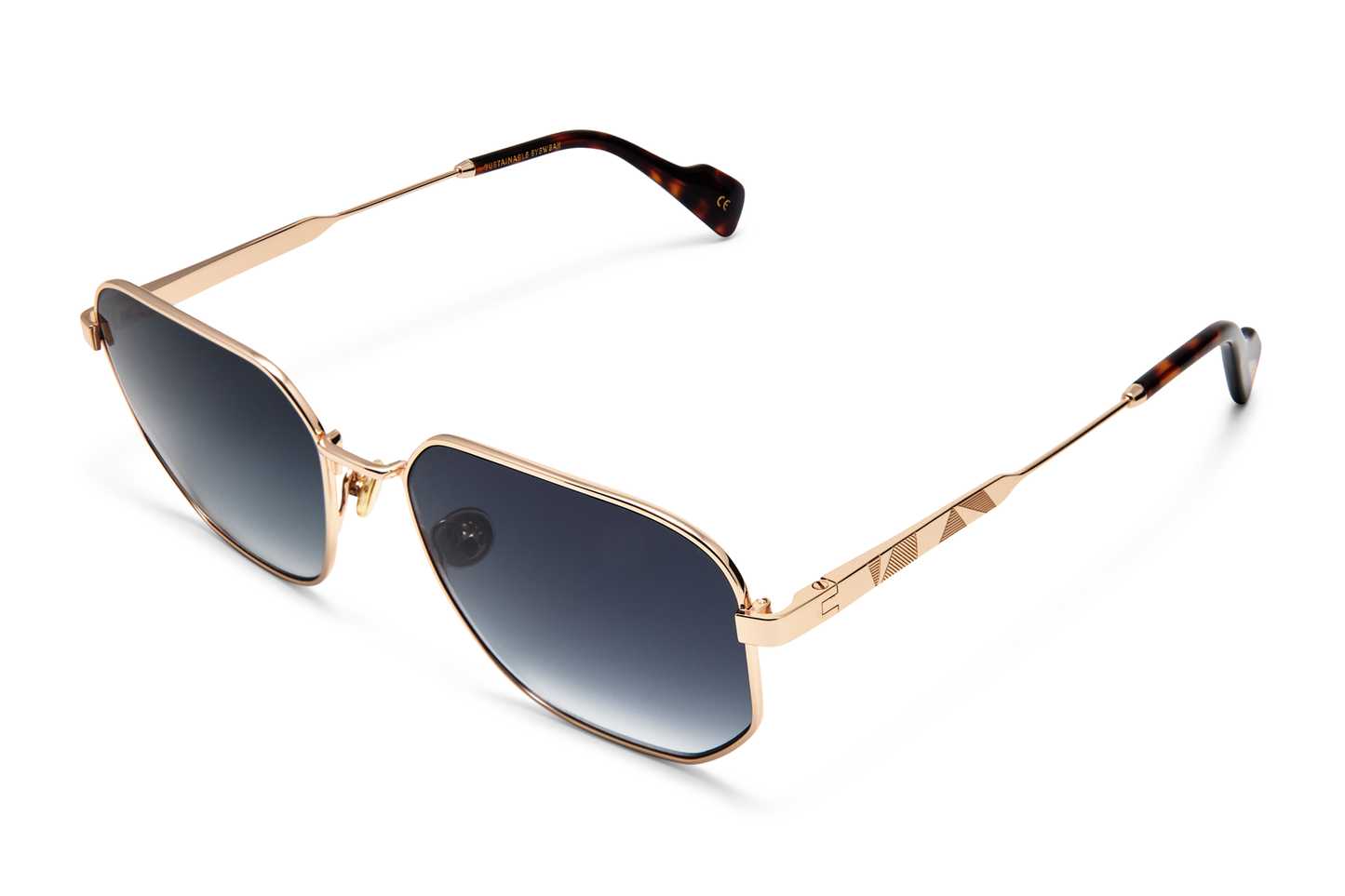 JUKTÅN is a light aviator frame crafted from Swedish recycled steel and biodegradable acetate. The temples feature a pattern depicting a mountain range, and the end-tips have inlays of sustainably and ethically sourced reindeer antler. The sunglasses have bio-nylon lenses that provide 100% protection from UVA, UVB, and UVC rays.