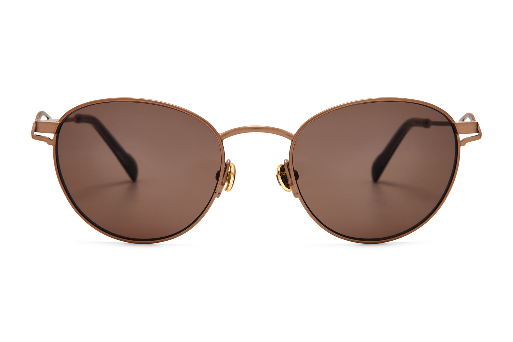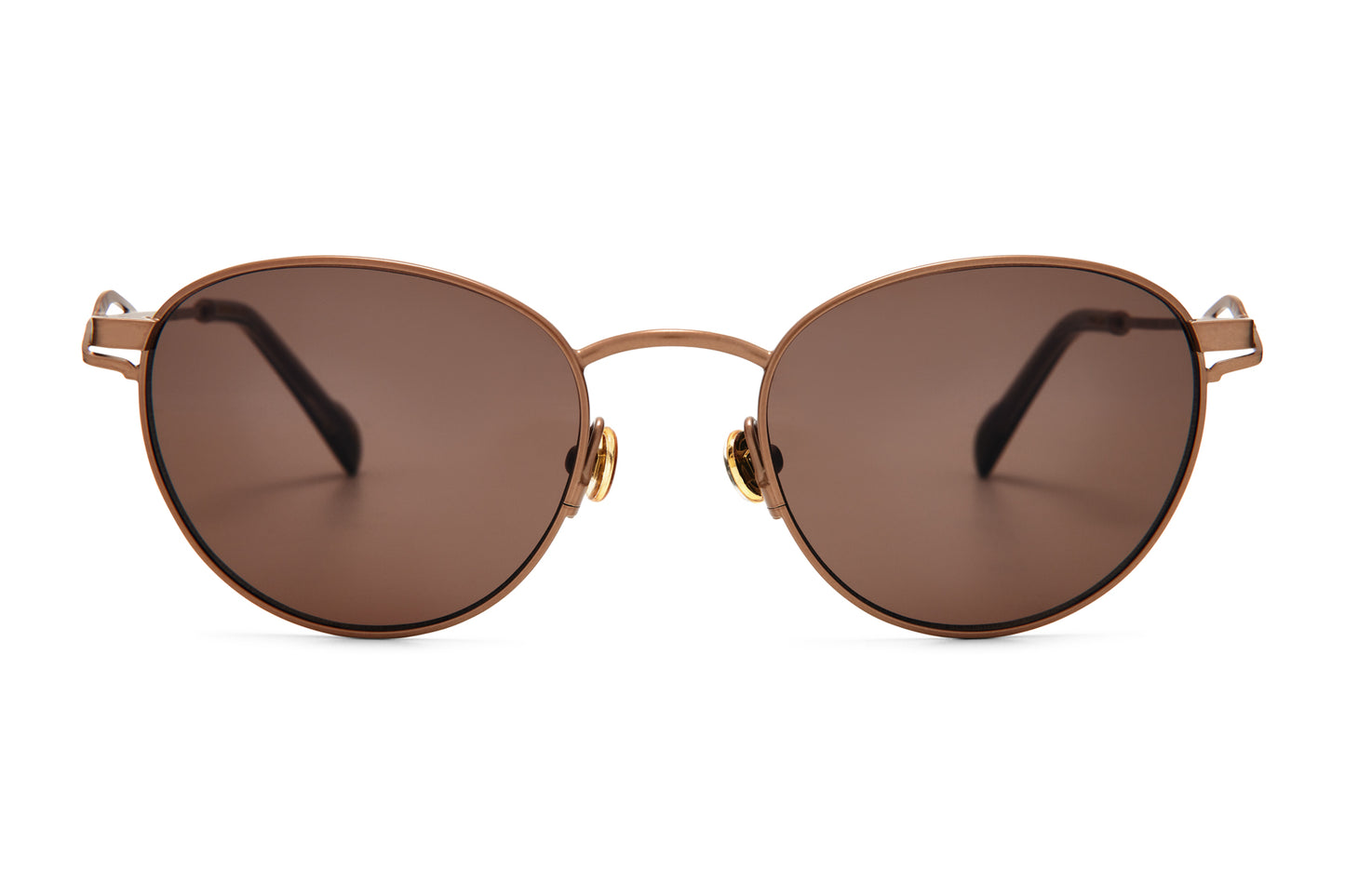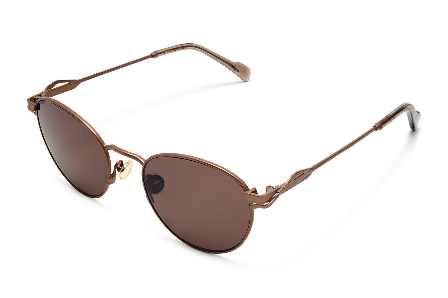 KÄRLEKSÖRT is a light round frame crafted from Swedish recycled steel, with temples adorned with a detail inspired by a twirling flower stalk. The sunglasses feature bio-nylon lenses that provide 100% protection from UVA, UVB, and UVC rays.