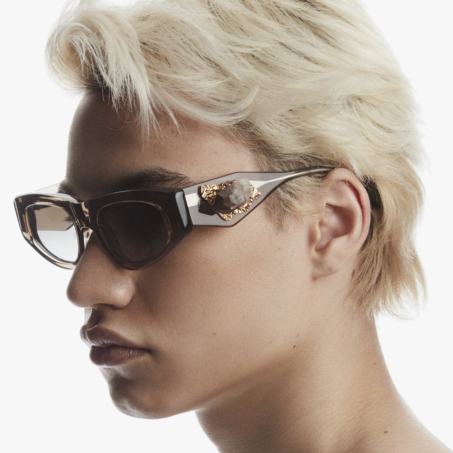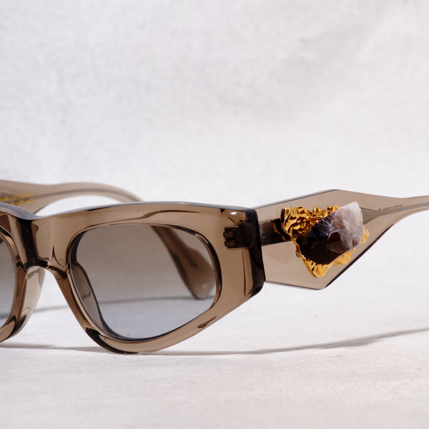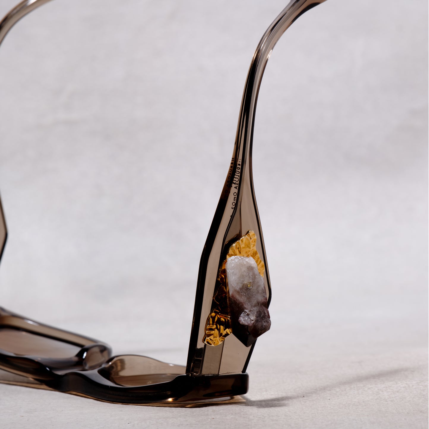NEBULOSA, a one of one pair of eyewear from our Eternity Collection, featuring an 18K gold plate from Swedish Lannavaara and a natural smoky quartz.