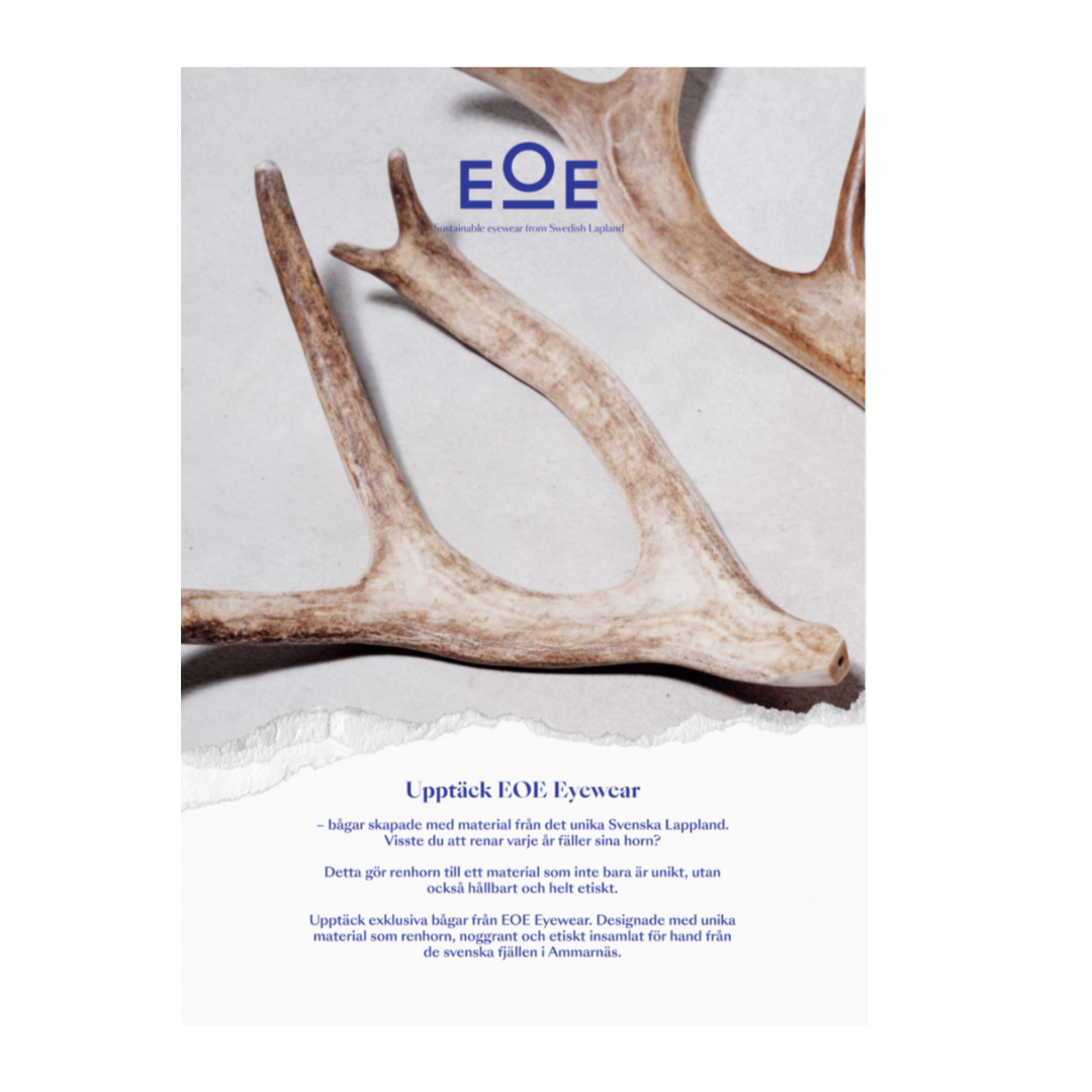 Table talker with base featuring a motif of reindeer antlers and information about frame materials.