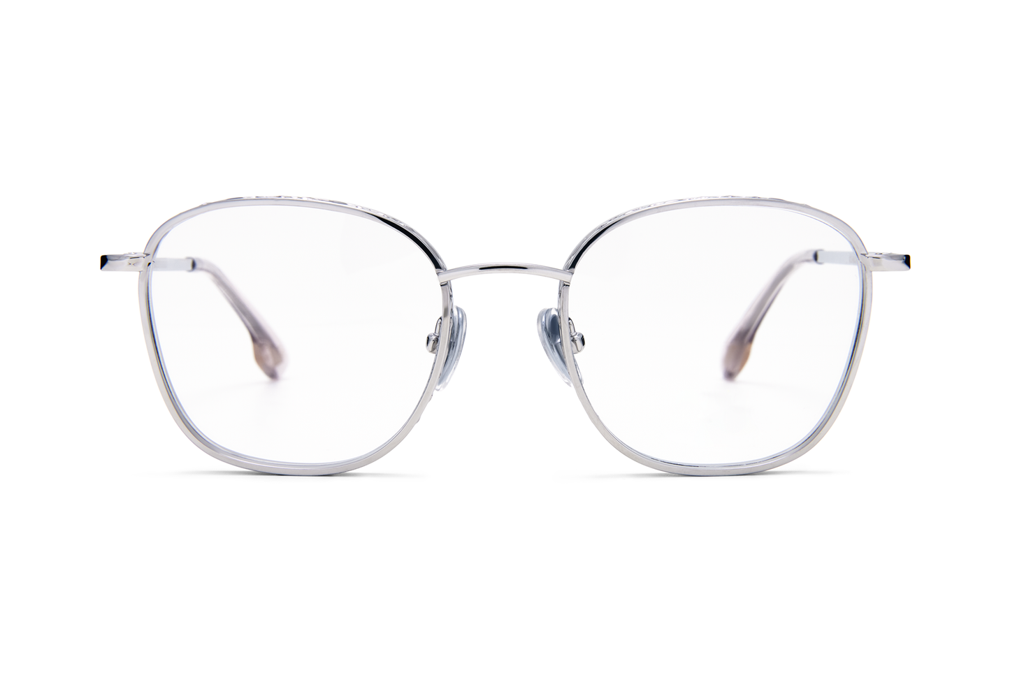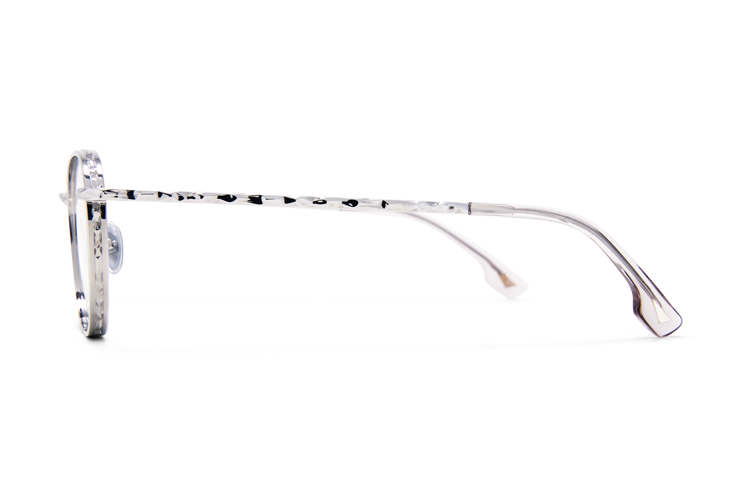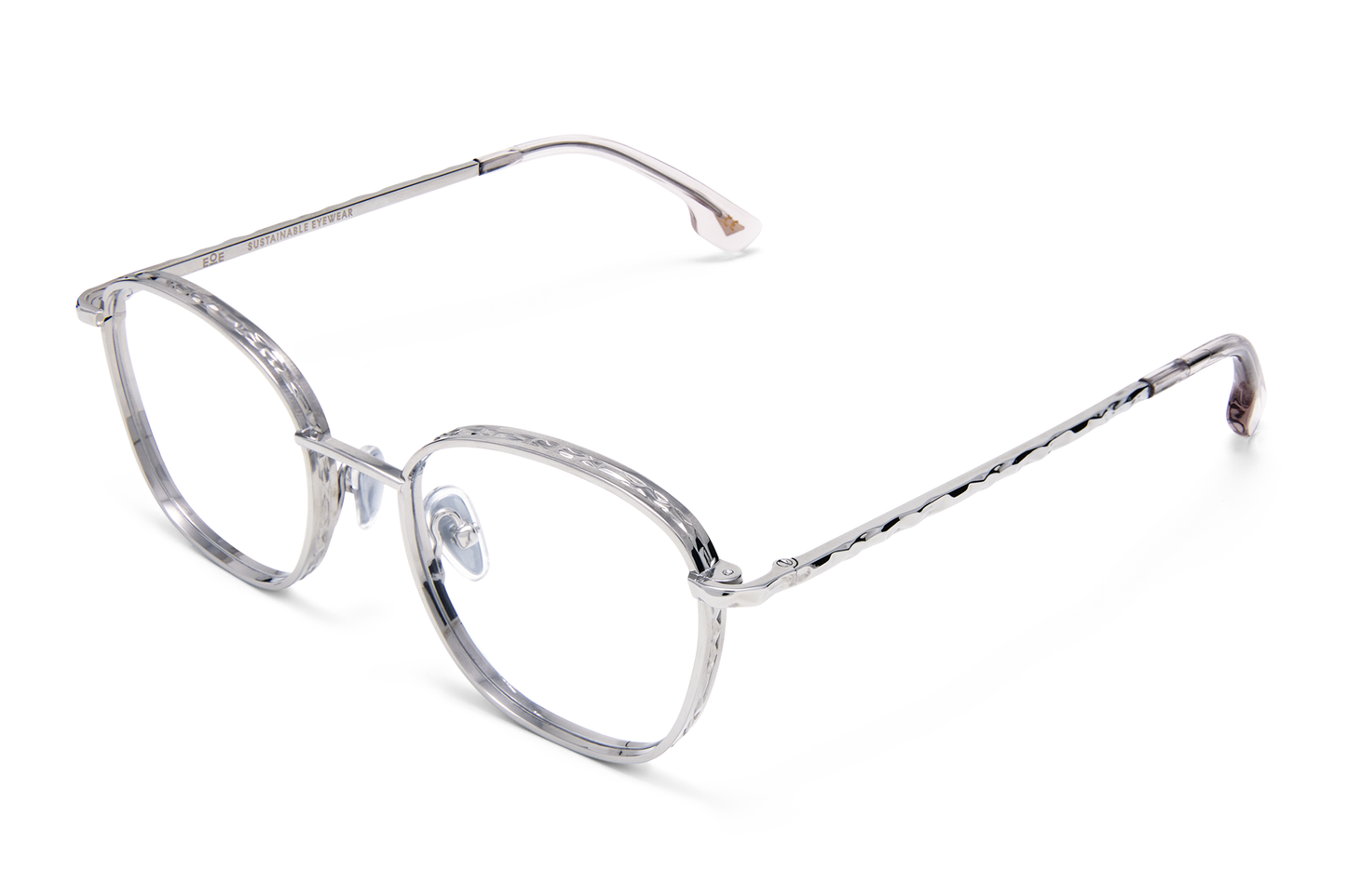 RÖNNSKAR is a light frame crafted from titanium and biodegradable acetate. The temples features a pattern reminiscent of the movement of water, and the end-tips are decorated with inlays of sustainably and ethically sourced reindeer antler.