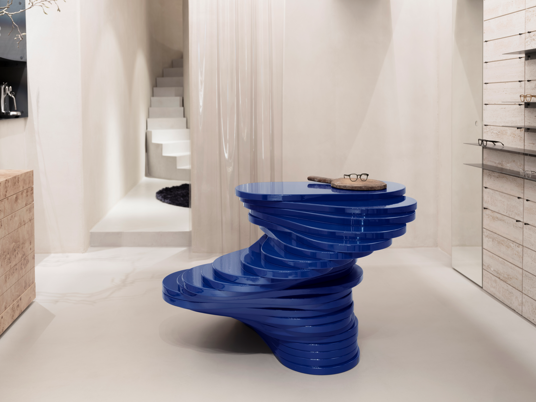 I hjärtat av butiken står en särskilt designad Klein-blå disk, som fungerar som både en funktionell och symbolisk mittpunkt. Inspirerad av vattnen, sjöarna och de isiga bergen i norra Sverige.