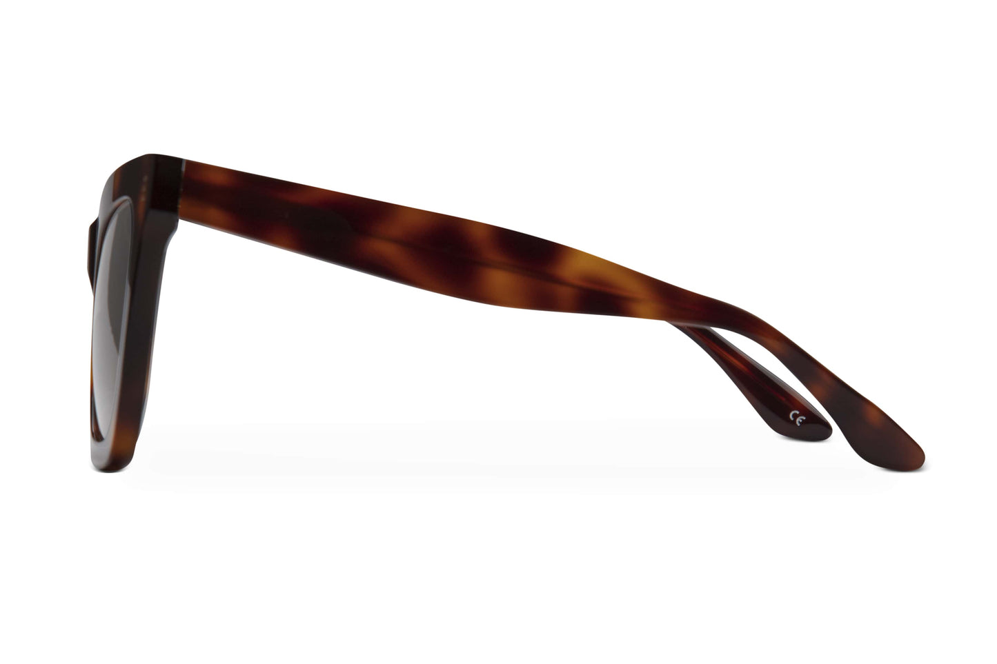 BURTRÄSK är en cat eye-båge tillverkad av biologiskt nedbrytbar acetat och återvunnet svenskt stål. Solglasögonen har linser i bio-nylon som ger 100 % skydd mot UVA-, UVB- och UVC-strålar.