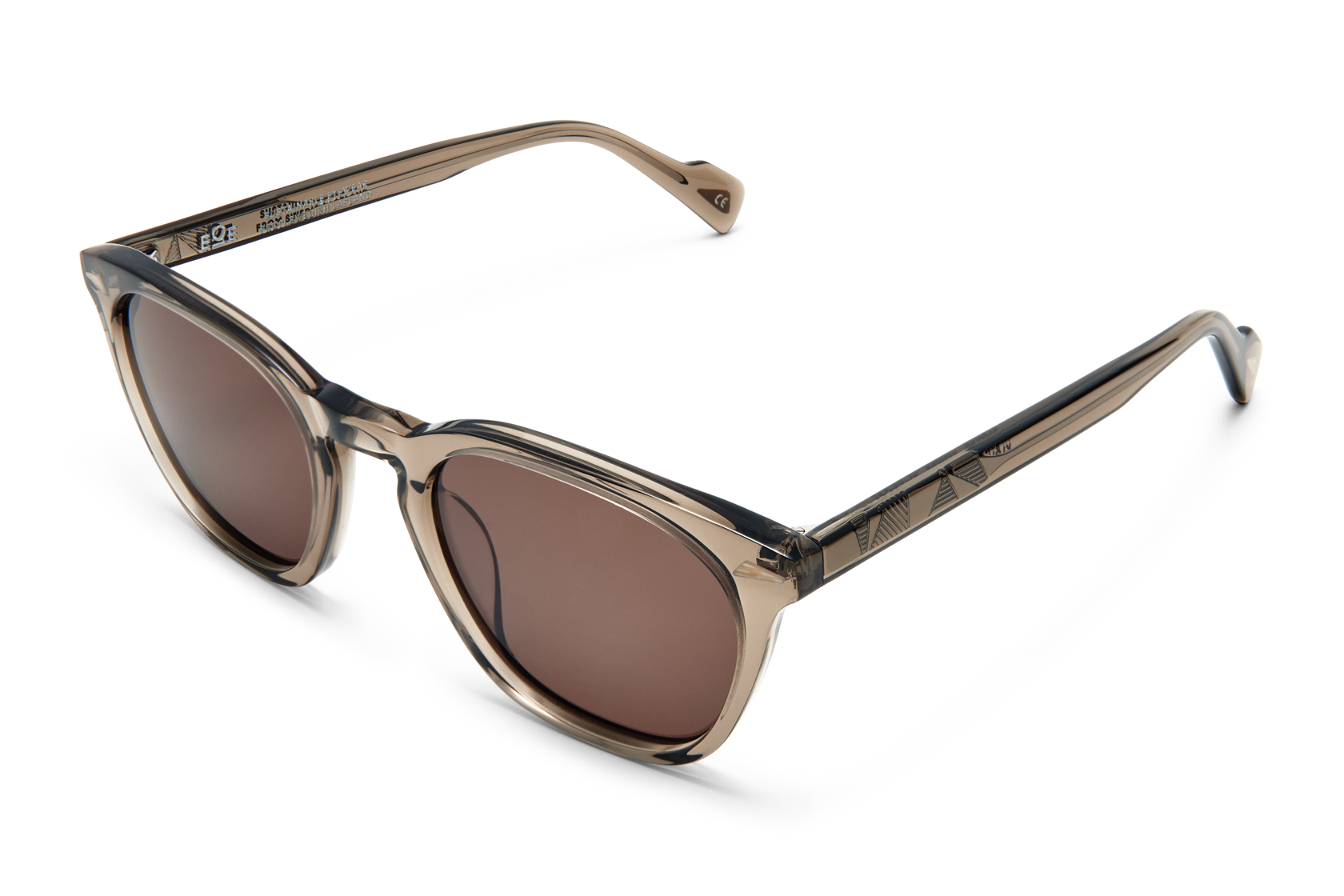 KLÖVER är en lätt fyrkantig båge tillverkad av biologiskt nedbrytbart acetat och återvunnet svenskt stål. Fronten och skalmtipparna pryds av inlägg av hållbart och etiskt insamlat renhorn, och på skalmarna syns ett mönster som påminner om en bergskedja.