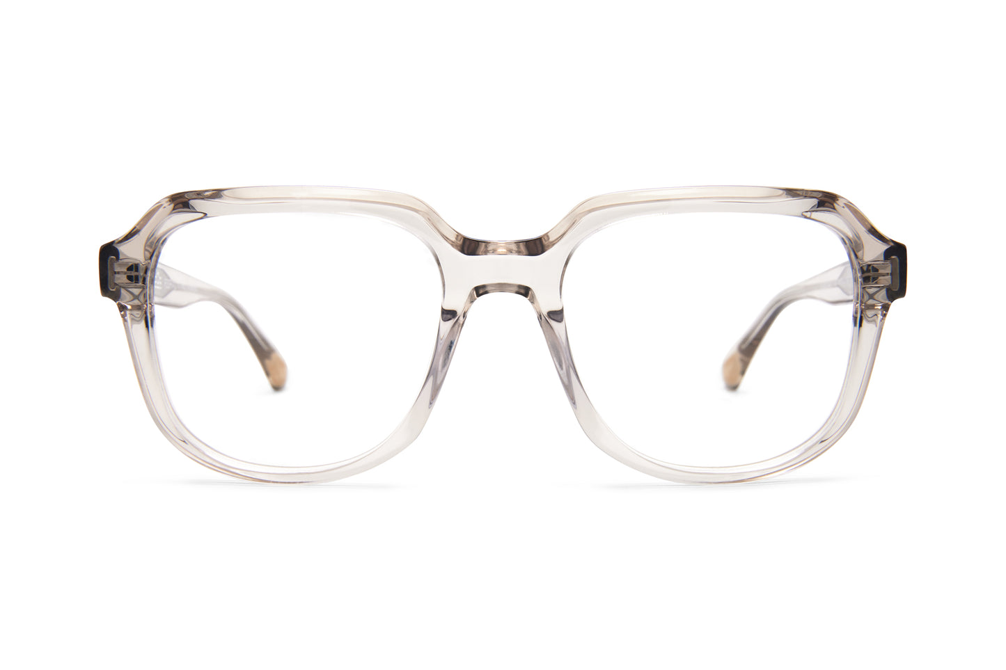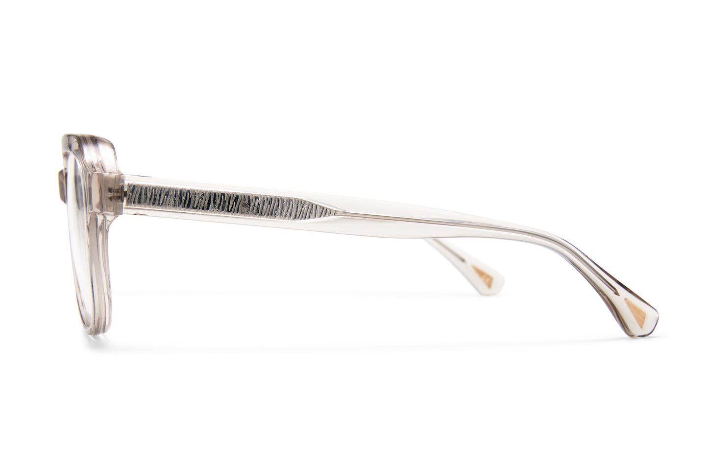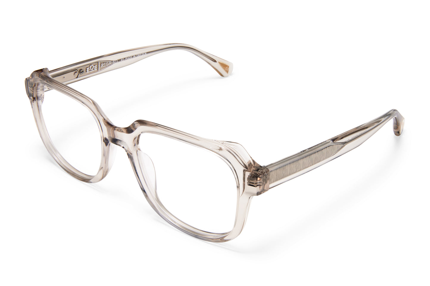 NANOFLOWER är en oversized fyrkantig båge tillverkad av spill från biologiskt nedbrytbar acetatproduktion och återvunnet svenskt stål. Ändarna pryds av inlägg i hållbart och etiskt insamlat renhorn.