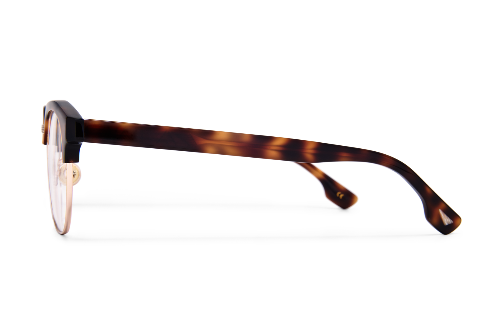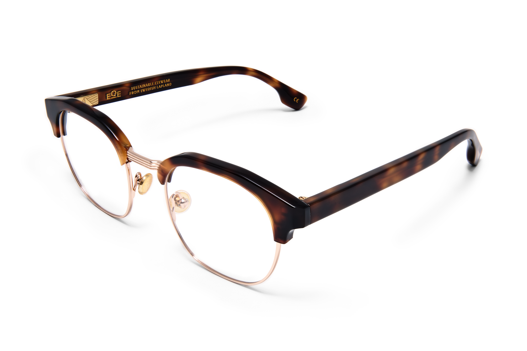 RAGGSJÖ är en clubmaster-båge tillverkad i bio-acetat och återvunnet svenskt stål. Ändtipparna är dekorerade med triangulära inlägg av hållbart och etiskt insamlat renhorn, och bågen är utrustad med näskuddar klädda i silikon för extra komfort.