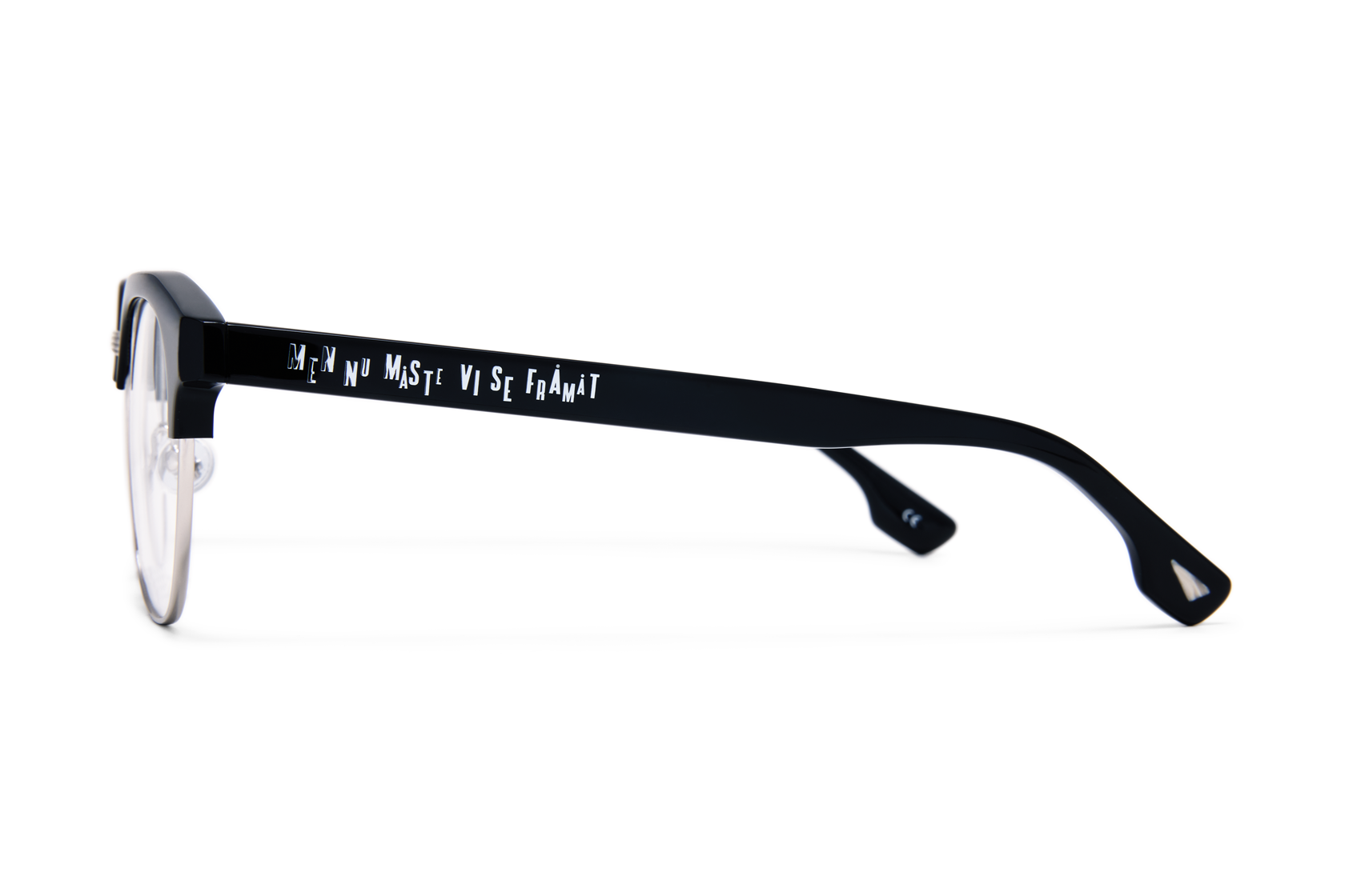 RAGGSJÖ AUTHOR är en clubmaster-båge tillverkad i bio-acetat och återvunnet svenskt stål. Ändtipparna är dekorerade med triangulära inlägg av hållbart och etiskt insamlat renhorn, och näskuddarna är klädda i silikon för extra komfort.