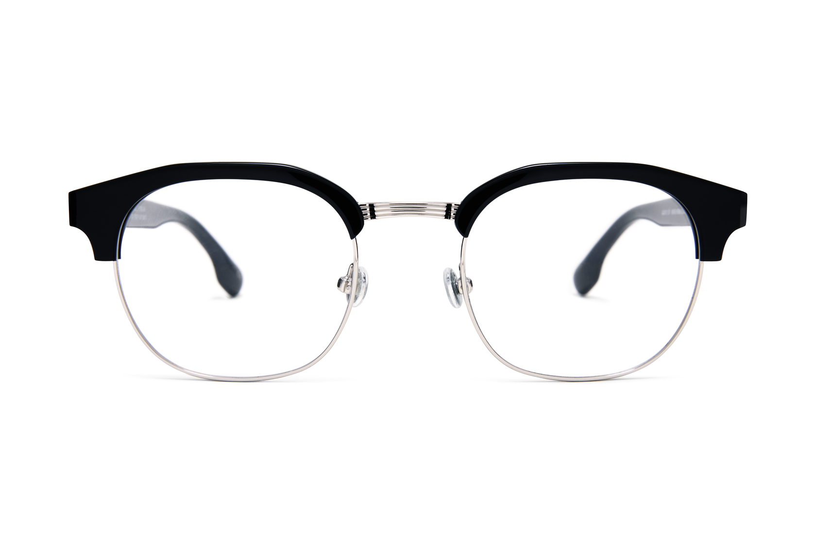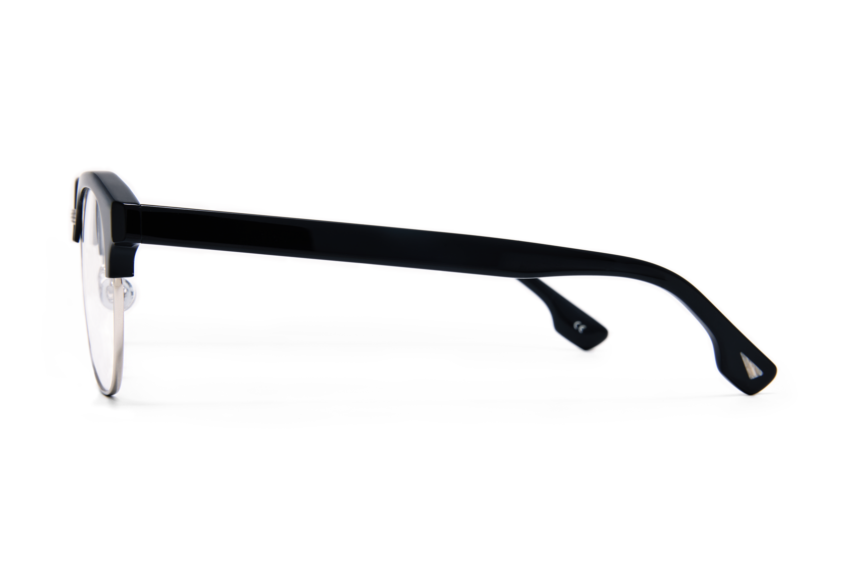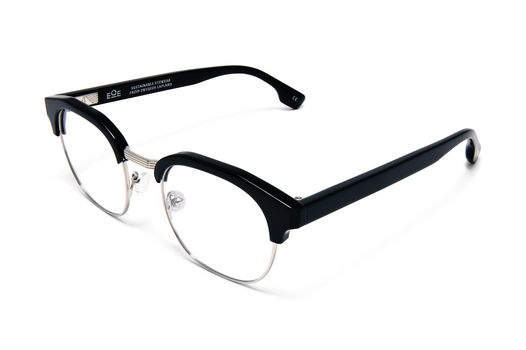 RAGGSJÖ är en clubmaster-båge tillverkad i bio-acetat och återvunnet svenskt stål. Ändtipparna är dekorerade med triangulära inlägg av hållbart och etiskt insamlat renhorn, och bågen är utrustad med näskuddar klädda i silikon för extra komfort.